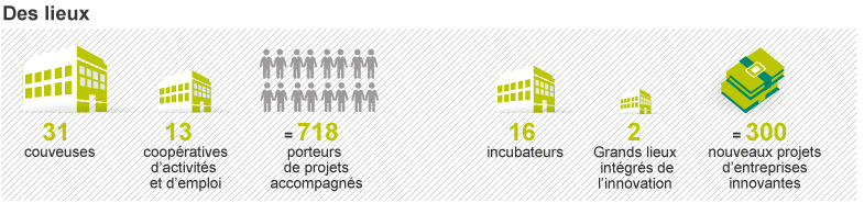 La Région finance également 31 couveuses d’entreprises, 13 coopératives d’activité et d’emploi, soit près de 718 porteurs de projets accompagnés dans ce cadre. Les 16 incubateurs et 2 grands lieux de l’innovation hébergent plus de 300 nouveaux projets d’entreprises innovantes.