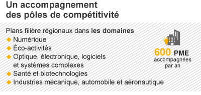 Enfin un accompagnement des pôles de compétitivité a été mis en place, il permet l’accompagnement de 600 PME par an par le biais de plans filière régionaux dans les domaines du numérique, des éco-activités, de la santé ou encore des industries mécaniques.