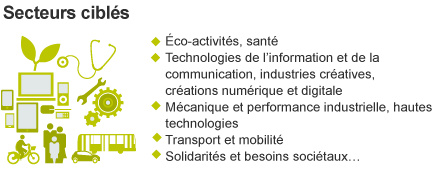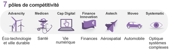 Il existe 7 pôles de compétitivité sur des domaines comme les écotechnologies, la santé, le numérique, la finance, l’aérospatial, l’automobile et les systèmes d’optique. Deux clusters et 16 incubateurs (dont 9 à Paris) complètent le dispositif.