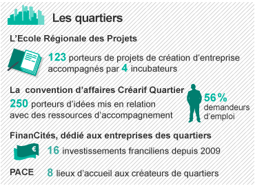 Dans les quartiers, l'Ecole régionale des projets a soutenu 123 porteurs de projets de création d'entreprise. La Convention d'affaires Créarif Quartier a permis à 250 porteurs d'idées d'être mis en relation avec des ressources d'accompagnement. FinanCités a permis 16 investissements depuis 2009. Enfin, PACE offre 8 lieux d'accueil aux créateurs de quartiers.