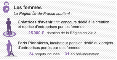 Les femmes : le premier concours dédié à la création et la reprise d'entreprises par les femmes s'intitule "Créatrices d'avenir", il est doté de 25000 euros de dotations. Et Paris Pionnières, l'incubateur dédié aux projets d'entreprises portés par des femmes, a aidé 24 projets et 31 autres sont en pré-incubation.