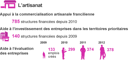 Pour l'Artisanat, 3 dispositifs sont en place : l'appui à la commercialisation artisanale francilienne (785 structures financées depuis 2010) ; l'aide à l'investissement des entreprises dans les territoires prioritaires (140 structures financées depuis 2009) ; l'aide à l'évaluation des entreprises (378 emplois créés en 2012).