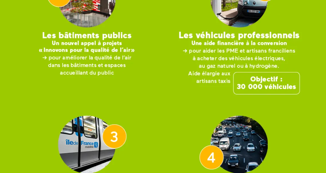Parce qu’il s’agit de l’une des premières préoccupations environnementales des Franciliens, la Région a mis en place un Pacte pour la qualité de l’air. Son objectif : décongestionner le trafic routier via notamment l’essor du covoiturage et la création de 10.000 places de parking supplémentaires aux abords des gares, la modernisation des réseaux de transport et le développement des énergies renouvelables. C'est ainsi qu'elle a conçu une aide permettant aux TPE-PME d'acheter des véhicules électriques, au GNV ou à l'hydrogène.