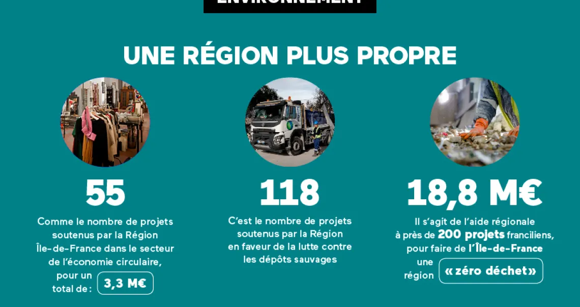 Au quotidien, la Région Île-de-France aide les communes à lutter contre les décharges sauvages avec le Fonds propreté, elle aide aussi collectivités, entreprises et associations à réduire, collecter et recycler les déchets. L'action régionale pour l'environnement vise à améliorer le cadre de vie des Franciliens et à aller vers une économie circulaire porteuse d’innovation et de création de valeur. La Région cherche aussi à être exemplaire dans ses propres établissements : dans les lycées et les services du Conseil régional, on s’attaque au gaspillage alimentaire et on recycle les papiers.