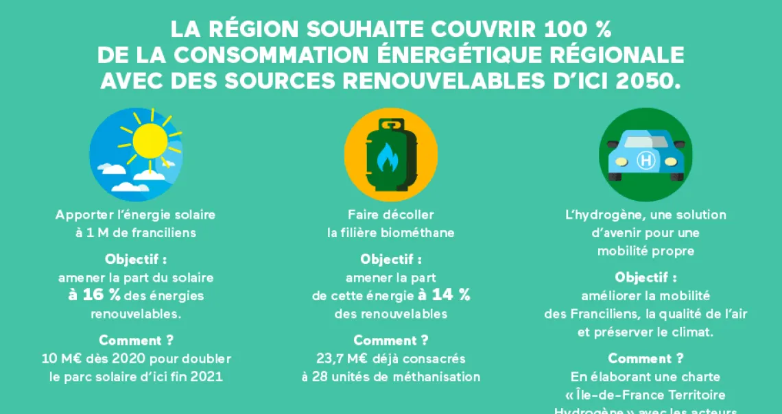 L’Île-de-France est très dépendante en énergie, gourmande en énergies fossiles et loin derrière sur les énergies renouvelables. Les enjeux de l’énergie et du climat sont extrêmement élevés pour l’avenir à tous points de vue : environnemental, économique, sanitaire et social... La transition énergétique représente aussi des opportunités à saisir pour les territoires, en terme de développement économique et d’emplois. La Région Île-de-France estime nécessaire de doter le territoire francilien d’une stratégie régionale, dont elle vient d’engager la construction avec tous les acteurs concernés. matériaux biosourcés, énergie solaire, méthanisation sont autant de pistes explorées par la Région.