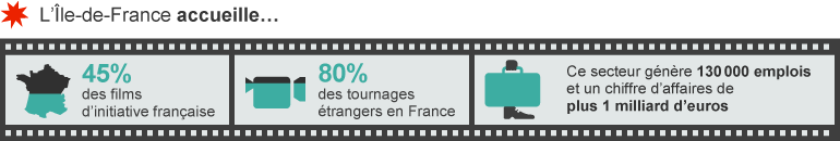 L'Île-de-France occupe une place dans l'industrie du cinéma : la région accueille 45% des films d'initiative française et 80% des tournages étrangers en France. Ce secteur génère 140 000 emplois et un chiffre d'affaires de 1 milliard d'euros.
