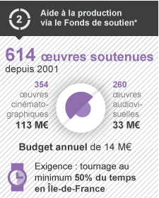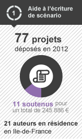 La Région propose diverses aide aux créateurs. L'aide à l'écriture de scénario a concerné 11 projets sur 77 déposés en 2012, pour un montant de 245 886 euros. L'aide à la production se fait à travers le Fonds de soutien aux industries techniques cinématographiques et audiovisuelles. Depuis 2001, celui-ci a soutenu 565 œuvres pour un total de 135,6 millions d'euros (une exigence : le tournage doit avoir lieu au minimum 50% du temps en Île-de-France) : 329 œuvres cinématographiques pour 105,9 millions d'euros et 236 œuvres audiovisuelles pour 29,7 millions. Enfin l'aide après la réalisation (montage, bruitage, effets spéciaux…) a concerné 225 bénéficiaires en 2012.