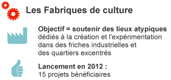 Nouveauté : les Fabriques de culture visent à développer des lieux atypiques dédiés à la création et l'expérimentation dans des friches industrielles et des quartiers excentrés. 15 bénéficiaires en 2012.