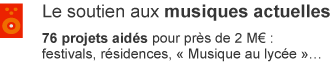 Enfin, le soutien aux musiques actuelles recouvre 76 projets en 2012 pour près de 2 millions d'euros.