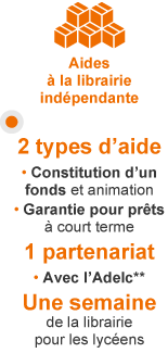 Les librairies indépendantes accèdent à deux types d'aides - constituer des fonds et accéder des garanties pour prêts à court terme -, un partenariat avec l'Association pour le développement de la librairie de création, une semaine de la librairie pour les lycéens.