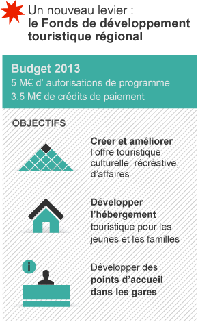 Grâce au Fonds de développement touristique régional (5 millions d'euros d'autorisations de programmes et 3,5 millions de crédits de paiements), la région souhaite créer et améliorer de l’offre touristique culturelle, récréative, d’affaires, développer l'hébergements touristique, destiné aux jeunes, aux familles et aux groupes et créer des points d’accueil dans les gares.