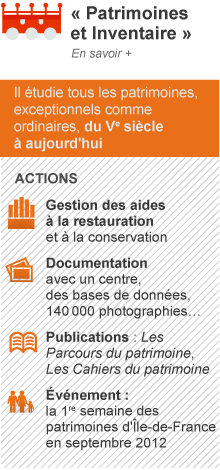 Il gère les aides à la restauration et à la conservation, il possède un centre de documentation (base de données, 140 000 photographies…), il publie "Les parcours du patrimoine", "Les cahiers du patrimoine" et un évènement particulier : la première semaine des patrimoines d'Île-de-France en septembre 2012.