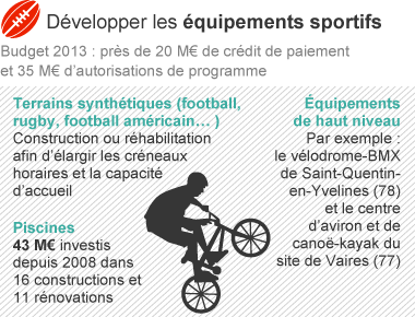 La région développe les équipements sportifs (budget 2013 : 19,6 M€ en crédits de paiement et 35 M€ en autorisations de programmes), notamment les terrains stynthétiques offrant des amplitudes d’utilisation plus importantes, les piscines (depuis 2008, 43 M€ investis) et les équipements de haut niveau (centre de haut niveau de Vaires et projet olympique du vélodrome et piste de BMX).