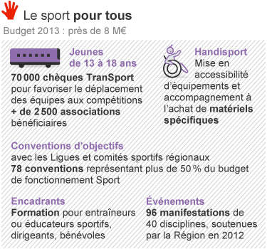La Région travaille à développer le sport pour tous grâce à un budget de près de 8 millions d'euros. Les Chèques TranSport permettent de régler les frais de transport des équipes de jeunes de 13 à 18 ans (70 000 en 2012). Dans le handisport, la Région aide à l'achat des matériels spécifiques. Pour les encadrants, des formations spécifiques sont proposées et elle a promu 96 manifestations sportives en 2012 (40 disciplines).