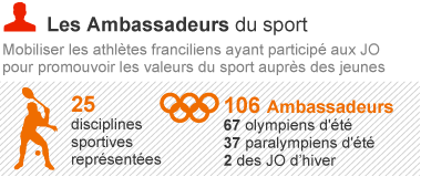 Enfin, les Ambassadeurs de sport permettent de mobiliser les athlètes franciliens ayant participé aux Jeux Olympiques et Paralympiques pour promouvoir les valeurs du sport auprès des jeunes : 19 disciplines, 90 ambassadeurs.