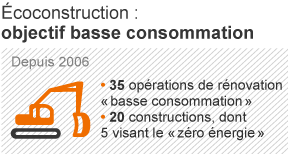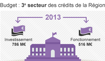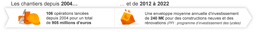 Depuis 2004, 106 chantiers ont été lancés pour un total de 905 millions d'euros. Et sur la période 2012-2022, ce sont 240 millions d'euros qui seront investis, en moyenne, chaque année dans des constructions neuves et des rénovations (dans le cadre du Programme d'investissement des lycées). L'écoconstruction a été mise au coeur de ces nouvelles opérations : depuis 2005, cet objectif concerne 35 opérations de rénovation "basse consommation" et 20 constructions, dont 5 visant le "zéro énergie".