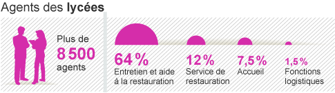 Plus de 8500 agents de lycées dépendent de la région : 64 travaillent dans l'entretien et l'aide à la restauration, 12% dans le service de restauration, 7,5% aux accueils et 1,5% dans des fonctions logistiques.