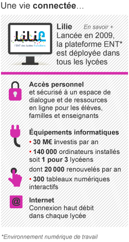 Une vie connectée : Lancée en 2009, la plateforme ENT (environnement numérique de travail) Lilie est désormais déployée dans tous les lycées. Elle donne un accès sécurisé et personnel à un espace de dialogue et de ressources en ligne pour les élèves, familles et enseignants. La région investit environ 30 millions d'euros par an dans les équipements informatiques. Les lycées compte 140000 ordinateurs installés, soit 1 pour 3 élèves, dont 20000 renouvelés chaque année. Une connexion haut débit est disponible dans chaque lycée.
