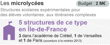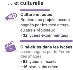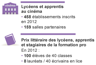 Une vie culturelle : Le programme "Culture en actes" est un soutien aux projet, accompagnés par les médiateurs culturels régionaux dans 32 lycées expérimentaux. Le programme "Lycéen et apprentis au cinéma" compte 458 établissements inscrits en 2012, ainsi que 159 salles partenaires. Le programme "Ciné-clubs dans les lycées" est accompagné par le Forum des images et a permis la création de 16 ciné-clubs grpace à 92 lycéens inscrits. Enfin, le "Prix littéraire des lycéens, apprentis et stagiaires de la formation pro" a permis à 100 élèves de 40 classes de distinguer 8 écrivains sur 40 en lice.