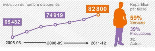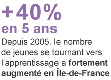 En 5 ans, le nombre de jeunes se tournant vers l'apprentissage à fortement augmenté en Île-de-France : +40%. En 2005, la région comptait 65482 apprenti, en 2008, 74919 et en 2011, 82800. Les filières sont ainsi reparties : 59% services, 39% productions et 2% autres.