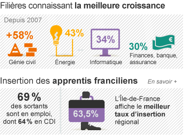 Depuis 2007, les filières connaissant les meilleures croissances sont : génie civil (+58%), énergie (+43%), informatique (+34%) et finances, assurance (+30%). Les apprentis franciliens rentrent avec succès sur le marché du travail : 69% des sortants sont en emploi, dont 64% en CDI.