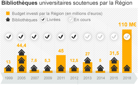 La région soutient depuis longtemps la création et rénovation de bibiliothèques étudiantes : 13 M€ en 1999 pour 1 opération, 44,4 M€ en 2005 pour 3 opérations, 7,6 M€ en 2007 pour 1 opération, 5,3 M€ en 2009 pour 1 opération, 45 M€ pour 1 opération en 2001, 12,5 M€ pour 1 opération en 2012, 27M€ pour 2 opérations en 2013, 5 M€ pour 1 opération en 2014, 31,5 M€ pour 2 opérations en 2015 et 110 M€ en pour 1 opération en 2018. Dans ces lieux, les étudiants peuvent accéder à du monitorat rémunéré : 215216 heures financées par la région depuis 2007 pour plus de 2M€.