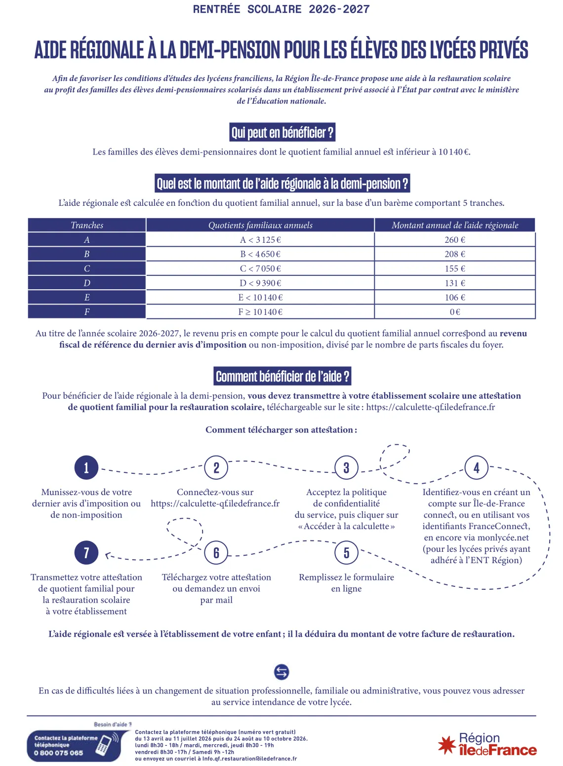 Repas au lycée Pour que tous les lycéens franciliens puissent étudier dans les meilleures conditions, la Région rend la restauration scolaire accessible à tous, dans le privé comme dans le public. Votre enfant est demi-pensionnaire dans un lycée privé sous contrat d’association avec le ministère de l’Éducation nationale ? Voici comment bénéficier de l'aide régionale.