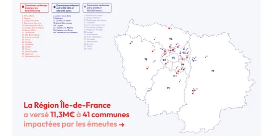 A la suite des émeutes qui ont eu lieu au début de l’été 2023 et qui ont provoqué d’importantes dégradations de bâtiments publics franciliens, la Région avait rapidement mis en place un fonds d’urgence de plus de 20 millions d’euros pour venir en aide aux communes touchées et reconstruire, partout en Île-de-France. Avec 18 millions d’euros alloués aux communes et 2 millions d’euros aux commerçants et aux artisans franciliens, le fonds d’urgence prend la forme d’avances remboursables allant jusqu’à 70% de prise en charge.