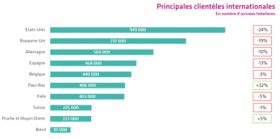 Si la clientèle touristique française continue de contribuer au maintien de l’activité touristique et de loisirs à Paris et en Île-de-France, représentant près de 60% de la fréquentation touristique sur ce 1er semestre 2022, les clientèles internationales ont été principalement de proximité : britannique, allemande, espagnole, belge ou néerlandaise. Cependant, d’autres plus lointaines notamment la clientèle américaine, redevenue la 1re clientèle de la destination, est de plus en plus présente.