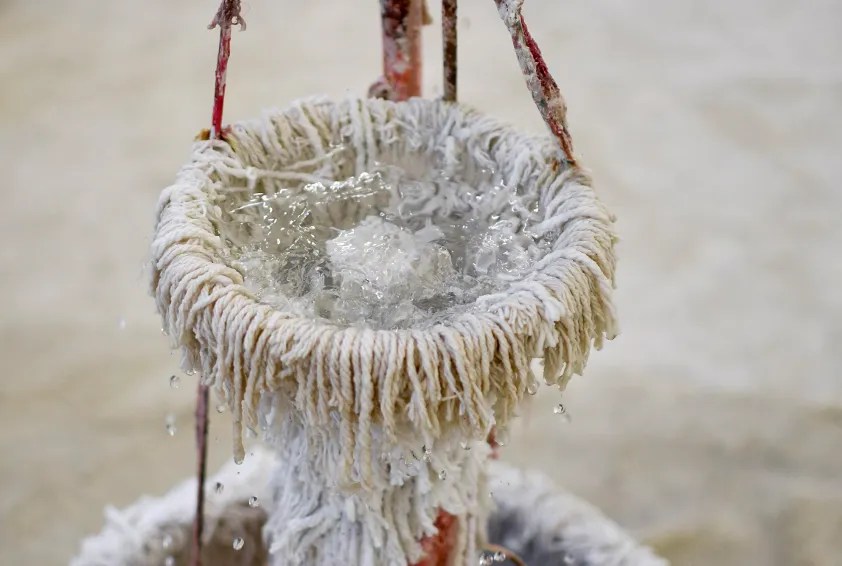 L'installation intègre une fontaine conçue avec plusieurs haut-parleurs recouverts de serpillères et plongés dans un bac rempli d’eau, lequel est prolongé par des excroissances qui se propagent au sol comme des champignons mutants. Rendus inopérants, les mégaphones sans voix nous invitent à les contempler dans une forme de quiétude, telle la fontaine d’une place de village.