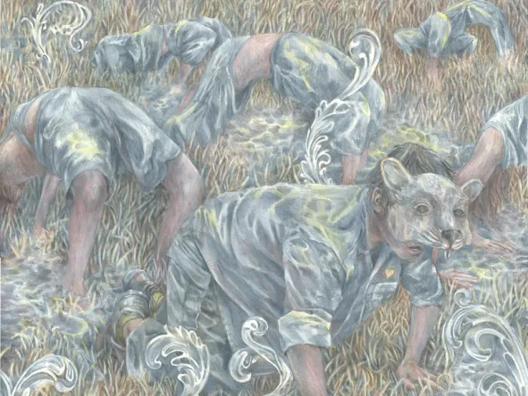 Les œuvres présentes au Plateau (œuvres de la collection du Frac, prêts d’œuvres et productions spécifiques pour l’expo) ont en commun de suggérer explicitement ou non, que des transformations s’amorcent. Ces dernières prennent la forme d’exercices, d’entraînements (Camille Juthier, Taus Makhacheva), d’expérimentations et de mutations tantôt fructueuses tantôt soldées d’échecs (Ceylan Östrük), qui opèrent à différents endroits, du micro au macro de corps individuels et/ou collectifs plus ou moins fictionnalisés (Jimmy Beauquesne). Avancer ou revenir en arrière, s’étirer ou se recroqueviller (Eglė Budvytytė), c’est dans cette ambiguïté et cette latence que les œuvres qui habitent cet espace se situent.