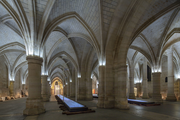 Plongée dans une lumière tamisée, rythmée par les piliers et les voûtes du monument, cette installation fait écho à l'histoire du lieu et au temps qui passe, en faisant appel aux cinq éléments : l'eau, le vent, le bois, le métal et la pierre.