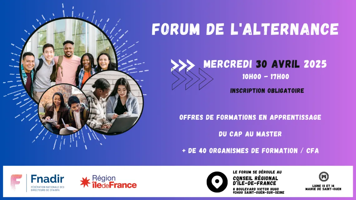 Rendez-vous au Forum de l'alternance que la Région organise ce 30 avril 2025, de 10h à 17h, dans ses locaux, à Saint-Ouen (93), en partenariat avec la Fédération nationale des directeurs de centres et organismes de formation d'apprentis (Fnadir).