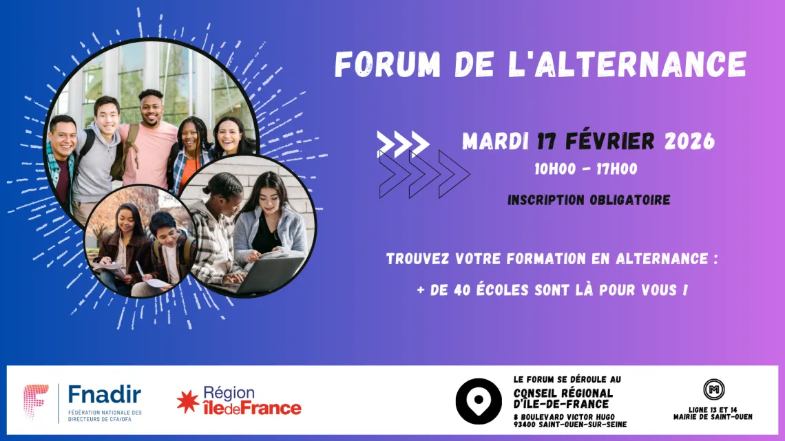 Rendez-vous au Forum de l'alternance que la Région organise ce 17 février 2026, de 10h à 17h, dans ses locaux, à Saint-Ouen (93), en partenariat avec la Fédération nationale des directeurs de centres et organismes de formation d'apprentis (Fnadir).