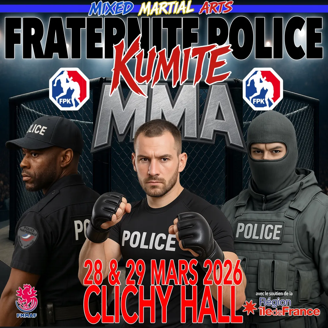 Organisé avec le soutien de la Région les 28 et 29 mars 2026 à Clichy (92), le Fraternité Police Kumite MMA est une compétition d'arts martiaux mixtes (MMA en anglais) :