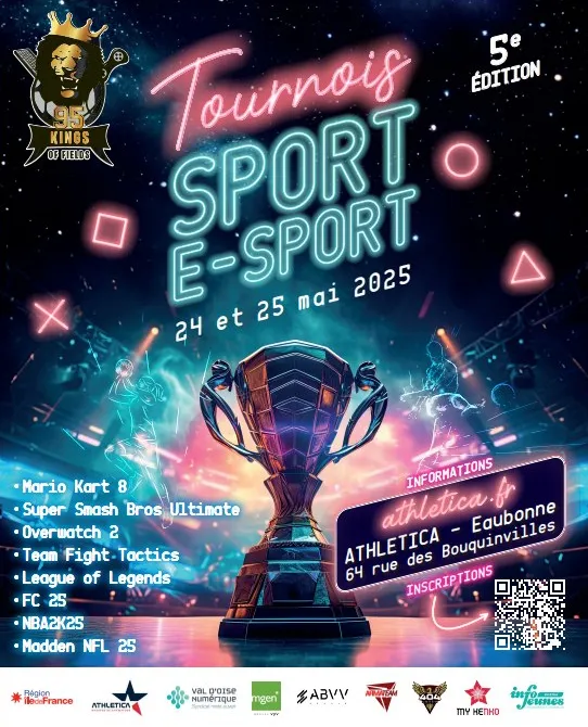Sport et e-sport Après 1 journée réservée aux collégiens-lycéens le 23 mai 2025, des joueurs tout public s'affrontent durant 2 jours à Eaubonne, les 24 et 25 mai 2025, sur jeux vidéo. En complément, pour des jeux comme FC25, NBA2K25 ou MADDEN NFL 25, ils pratiquent du foot, du basket ou du foot américain en vrai ! Avec le soutien de la Région.