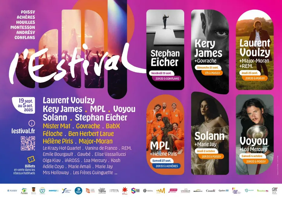 Parmi les 30 noms à l'affiche : Kery James, Laurent Voulzy, Voyou et Solann à Poissy, MPL à Achères, ou encore Stephan Eicher à Conflans-Sainte-Honorine.