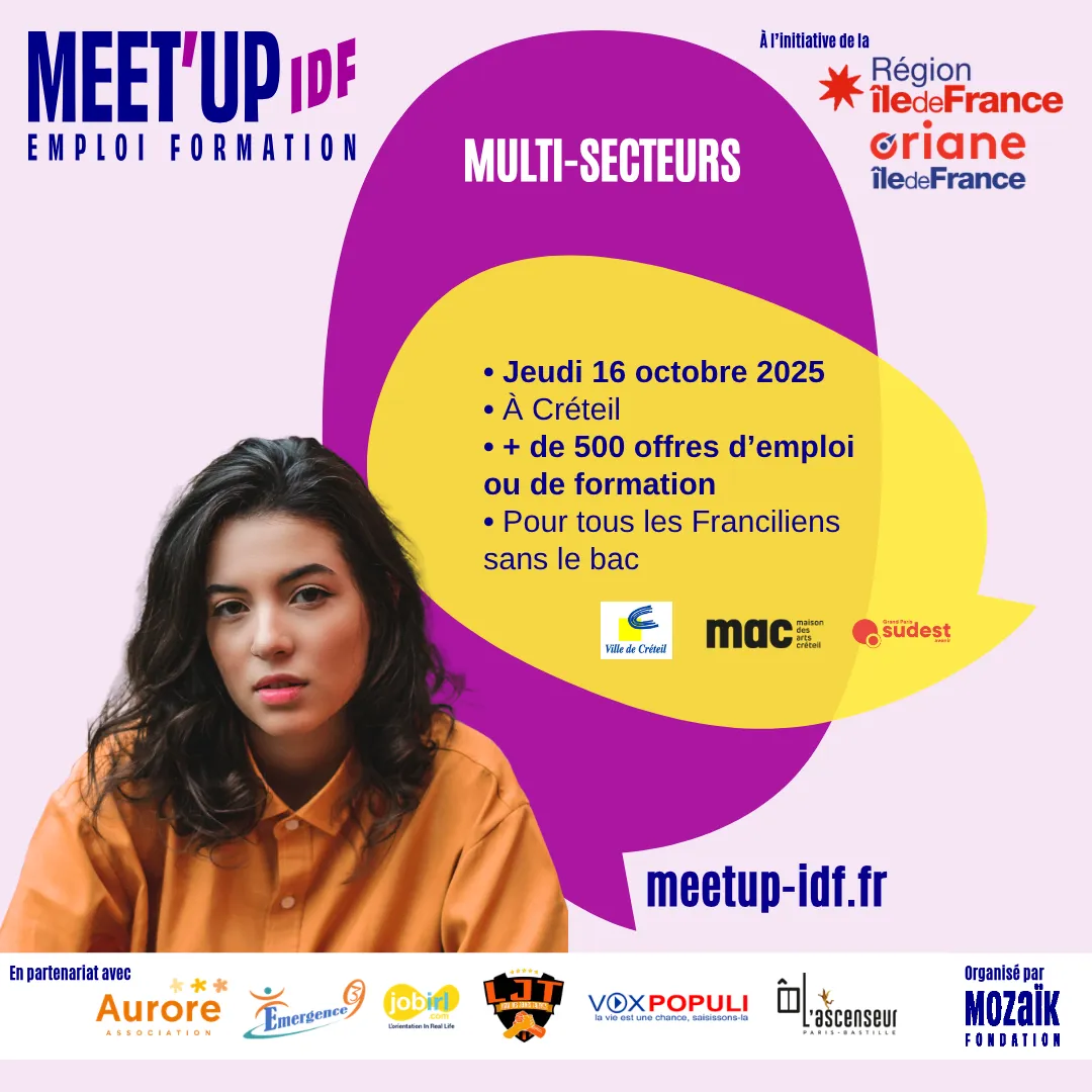 Formation-emploi Vous n'avez pas le bac et vous cherchez un emploi ou une formation dans un secteur qui recrute près de chez vous ? Rendez-vous le 16 octobre 2025 à Créteil pour un nouveau Meet’Up IDF Emploi Formation de la Région, organisé avec la Fondation Mozaïk. Outre des conseils et du coaching, plus de 500 offres multi-secteurs vous attendent. Précandidatures en ligne.
