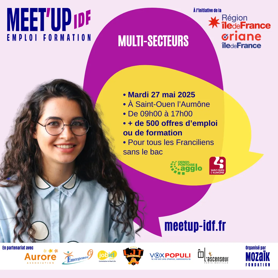 - Meet’Up IDF Emploi Formation multi-secteurs le 27 mai 2025, de 9h à 17h, à Saint-Ouen-l'Aumône (95),