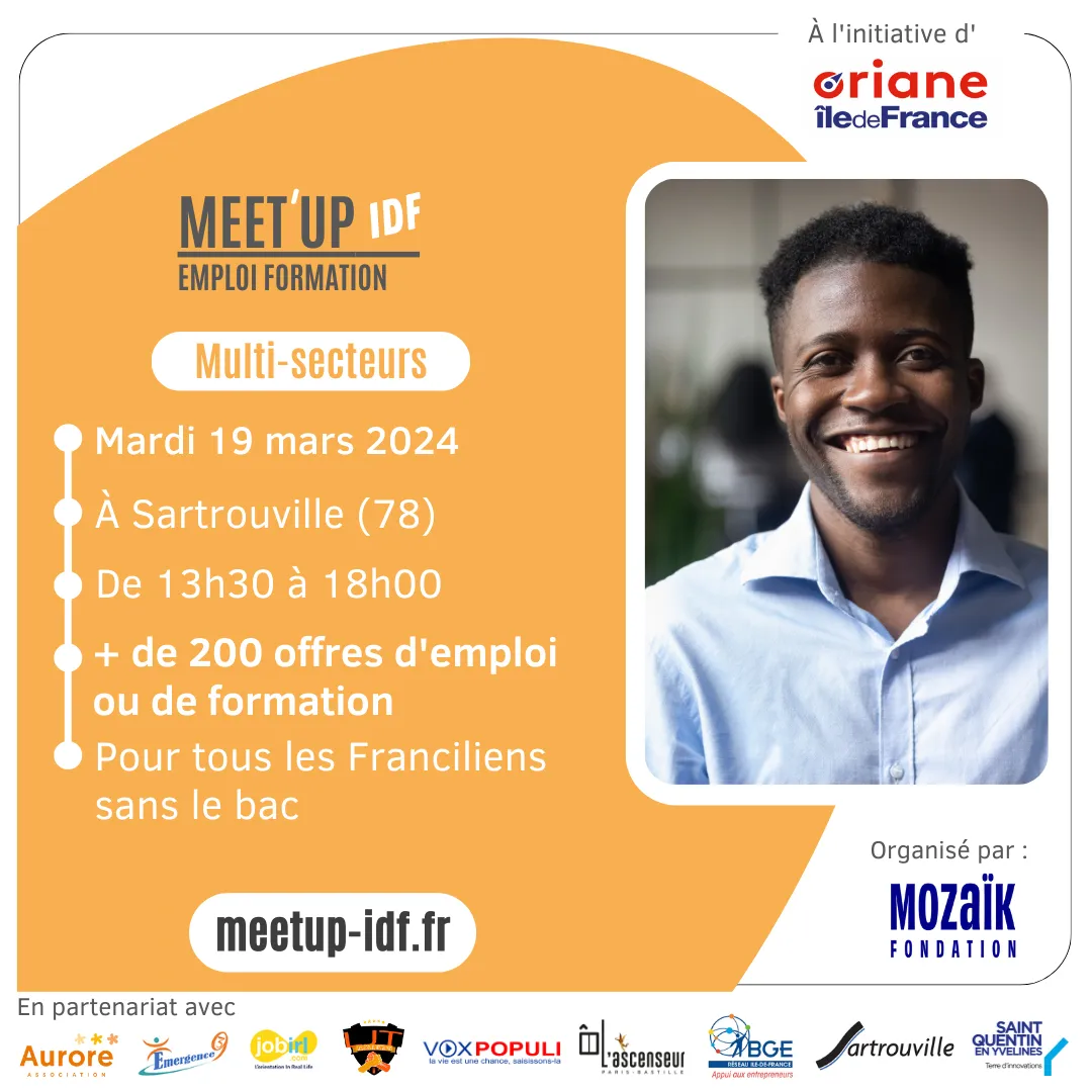 Les Meet'Up IDF Emploi Formation, dont les éditions sont tantôt thématiques, tantôt multi-secteurs, sont organisés à l'initiative de la Région Île-de-France par la Fondation Mozaïk, qui agit pour plus de diversité dans les entreprises.