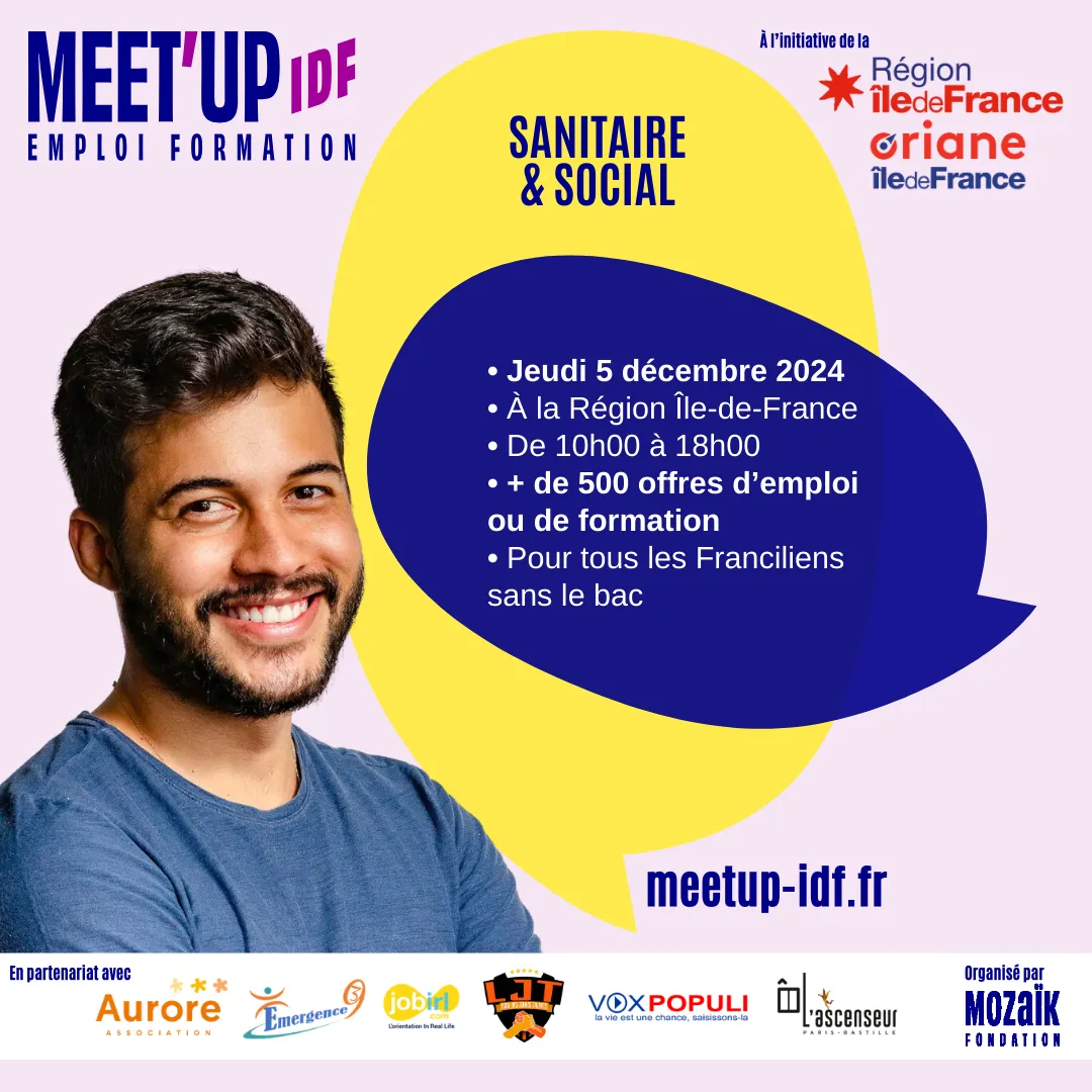 - Meet’Up IDF Emploi Formation spécial sanitaire et social le 5 décembre 2024 au siège de la Région, à Saint-Ouen (93).