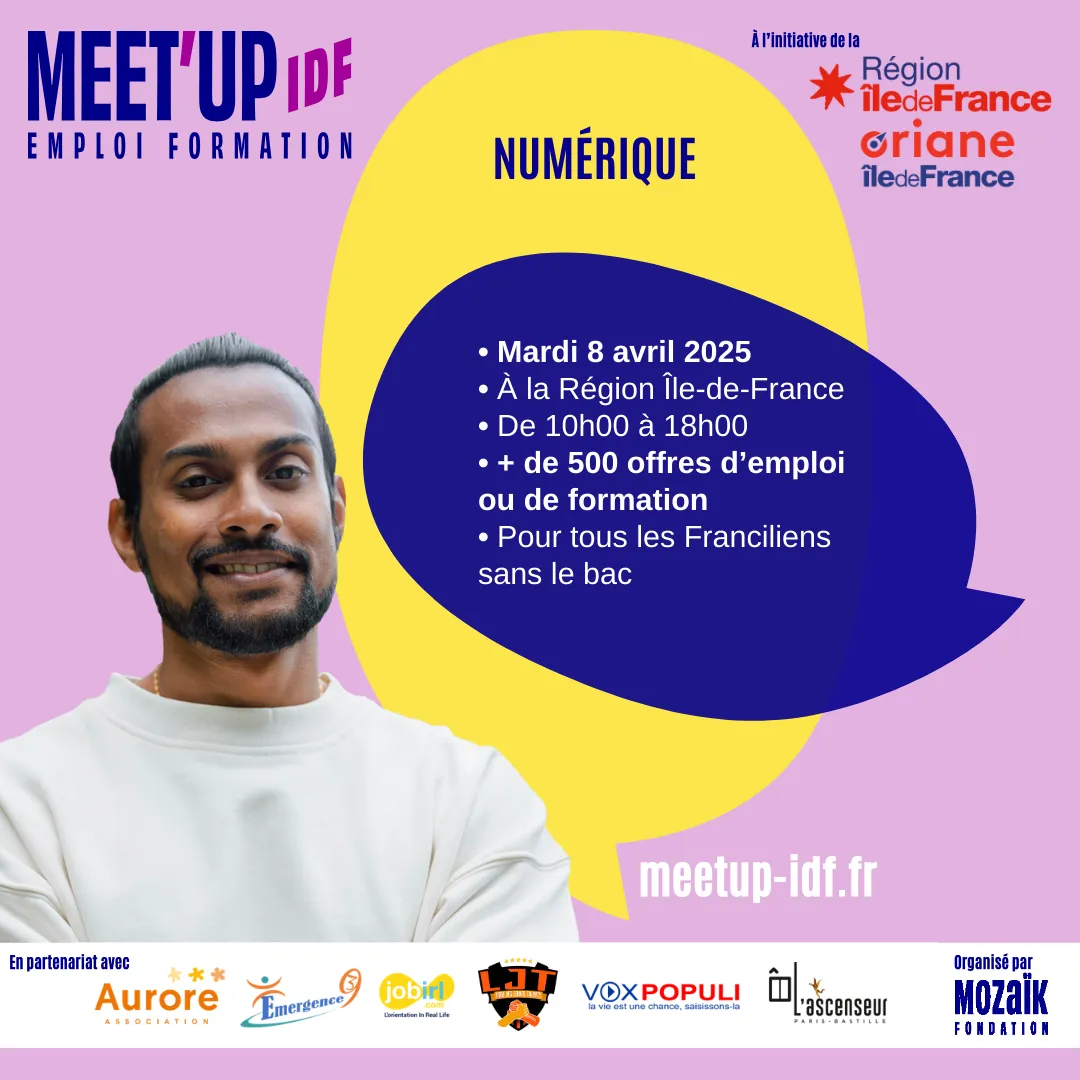 Formation-emploi Vous n'avez pas le bac et vous cherchez un emploi ou une formation dans un secteur qui recrute près de chez vous ? Rendez-vous le 8 avril 2025 au siège de la Région pour un nouveau Meet’Up IDF Emploi Formation de la Région, organisé avec la Fondation Mozaïk. Outre des conseils et du coaching, plus de 500 offres autour du numérique vous attendent. Précandidatures en ligne.