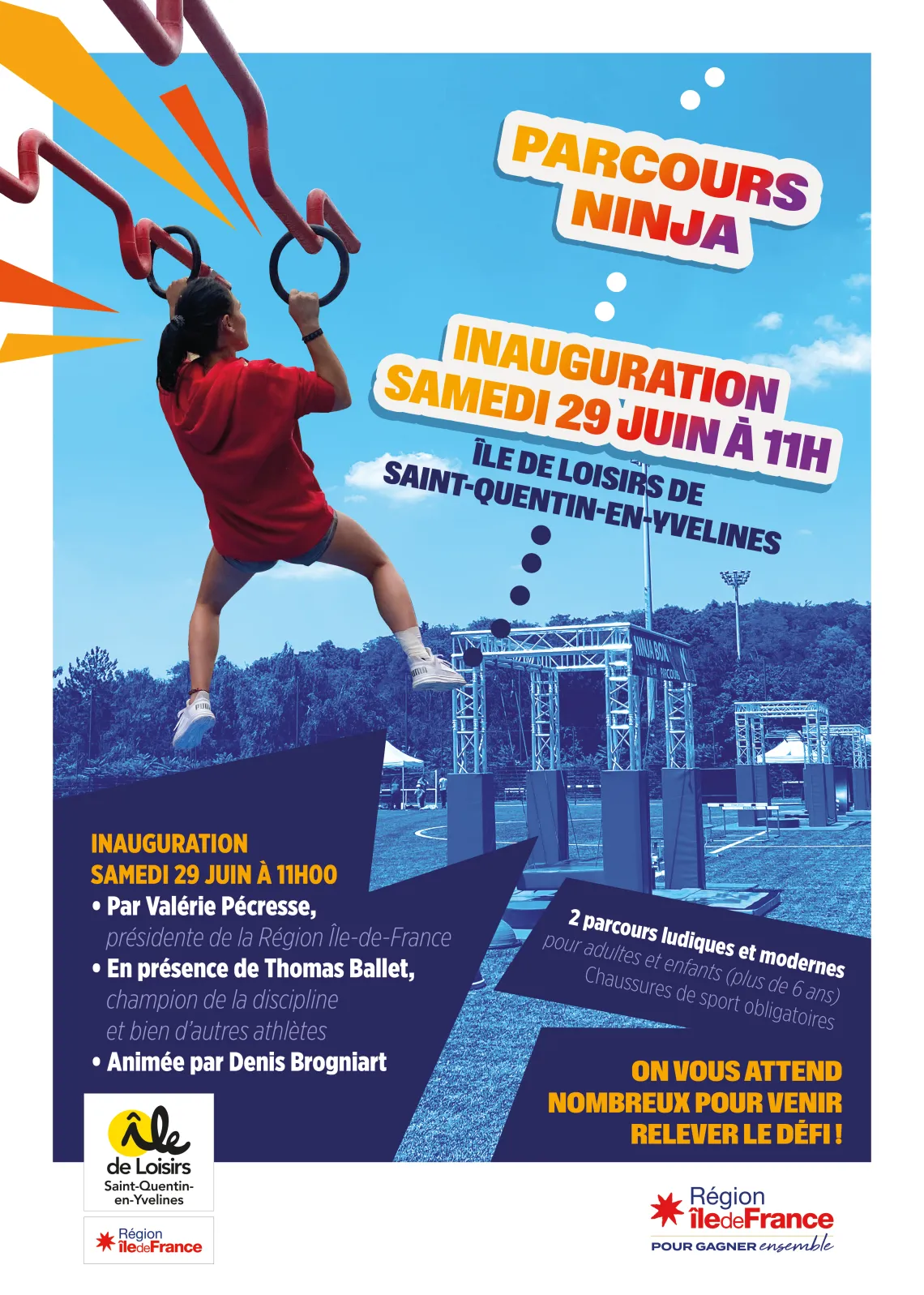 Avant son ouverture au public jusqu'au 21 juillet 2024, le Parcours Ninja de l'île de loisirs de Saint-Quentin-en-Yvelines (78) a été inauguré le 29 juin 2024 à l'occasion d'un grand événement sportif et festif gratuit.