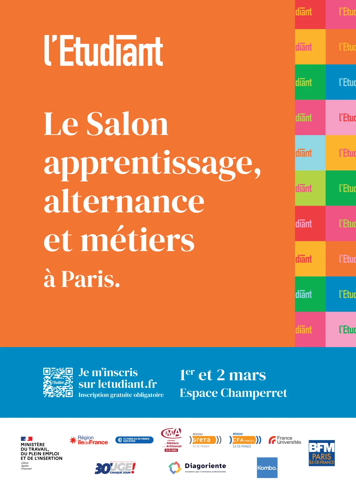 Orientation Collégien, lycéen ou étudiant, et si des études en alternance ou apprentissage étaient la solution ? Rendez-vous les 1er et 2 mars 2024 à Paris pour des conseils et trouver votre formation et votre employeur.