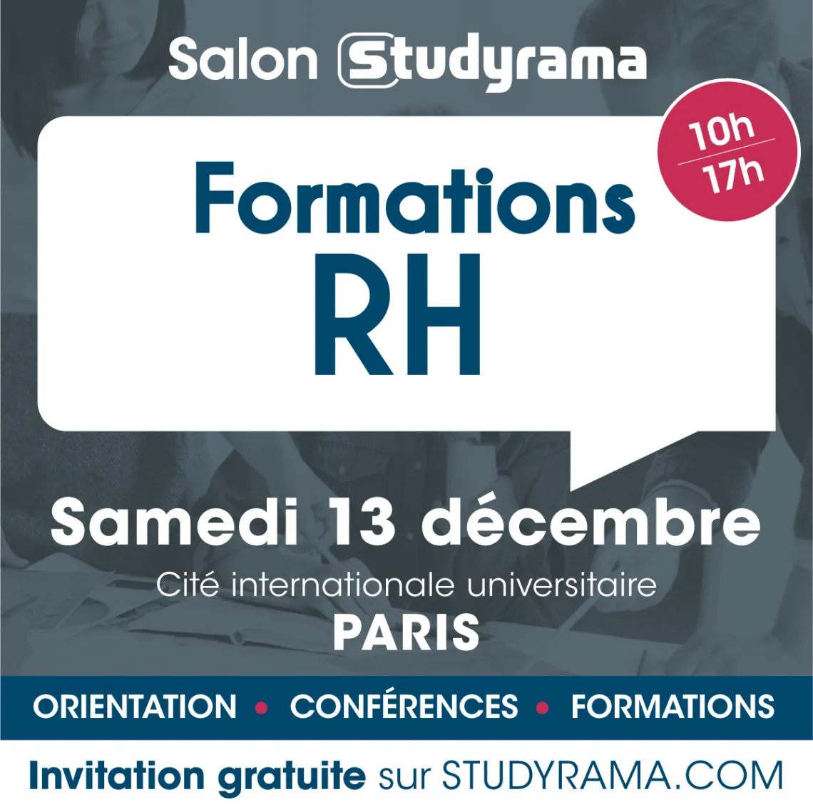 Orientation Studyrama propose, avec le soutien de la Région, un rendez-vous 2-en-1 le 13 décembre 2025 à la Cité internationale universitaire de Paris, pour se renseigner sur les formations en RH en Île-de-France et pour trouver, avec un niveau bac+3 , 4 ou 5, un master 1, un master 2, un mastère spécialisé (MS) ou un MBA.