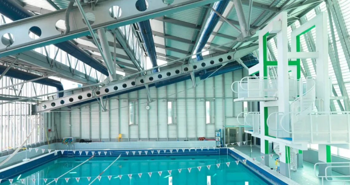 Les volumes abritant les bassins sont couverts par des coques en béton précontraint à double courbure dégageant une portée de 27 m de longueur du procédé Silberkühl, alors particulièrement novateur. La fosse à plongeon et le bassin olympique sont, quant à eux, bordés de gradins pouvant accueillir 600 spectateurs, tirant parti de la dénivellation entre les 2 bassins.