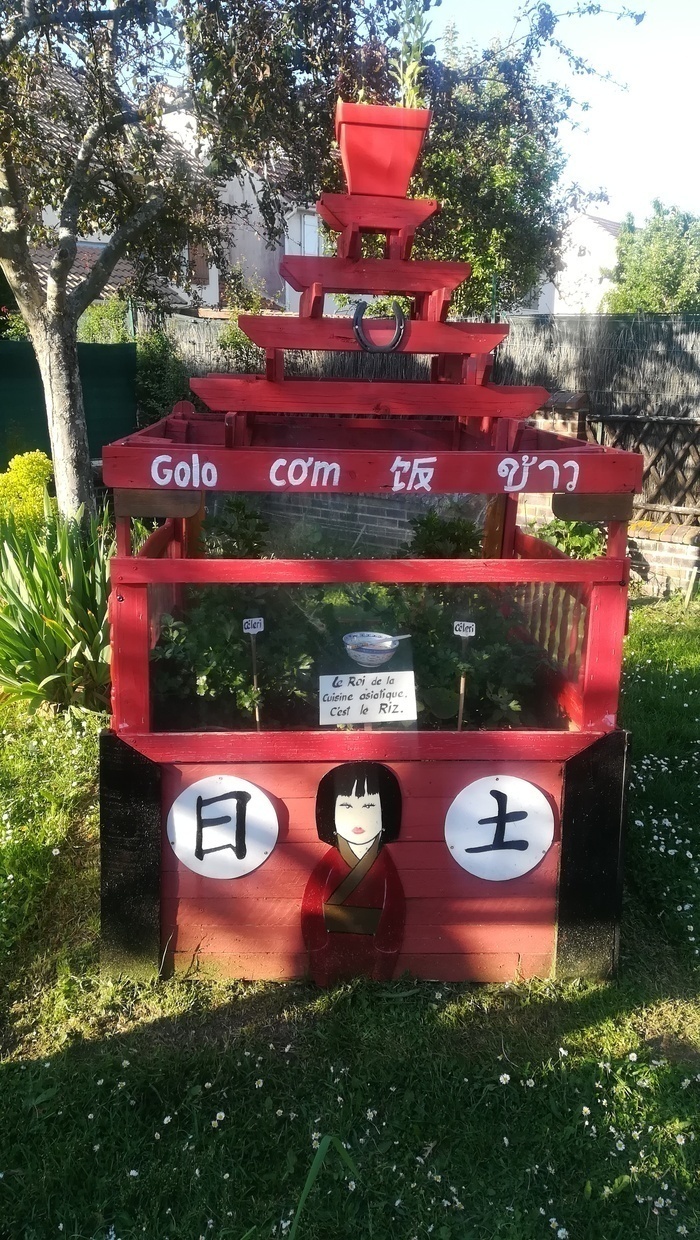 Les arbres sont entourés de bacs à fleurs. Le pourtour est planté de légumes.
