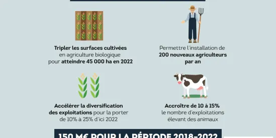 Un nouveau dispositif d'aide à l'agriculture biologique pour compenser, pour partie, le retrait de l'État dans l'aide au maintien, va être élaboré. L'ambition est de parvenir à 25 % de surfaces agricoles en bio d'ici 2030 contre 2 % en 2015.