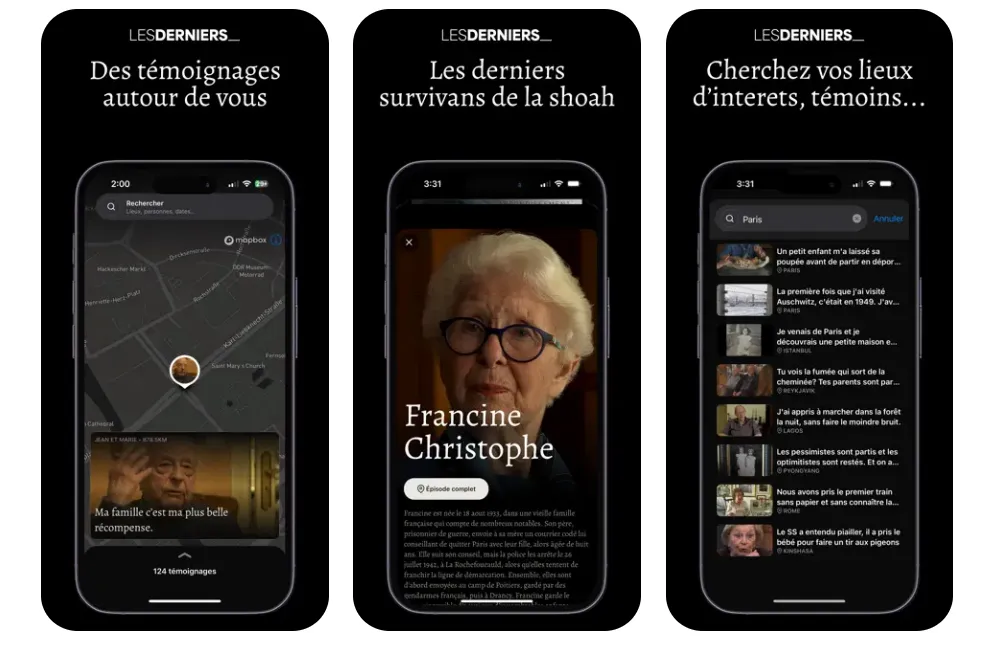 Conçue pour rendre la mémoire de la Shoah accessible et contemporaine, l'appli « Les Derniers » permet de s’immerger dans les récits des témoins et de les découvrir de manière interactive : 136 vidéos traitant de survie, de résilience et de courage face à l'horreur sont accessibles à partir de la géolocalisation de leurs lieux clés.