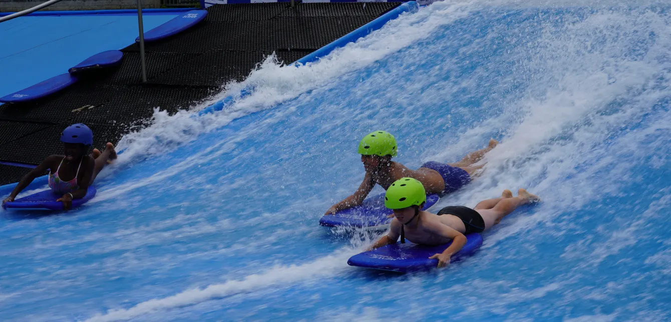 Il a le sourire jusqu’aux oreilles, Aden. Sur une planche de bodyboard, il essaie de se maintenir à flot sur l’une des plus grandes vagues à surf en extérieur d’Europe ! L’eau projetée à forte puissance crée une vague sur laquelle il faut essayer de glisser, sans se laisser emporter. Sensations garanties.